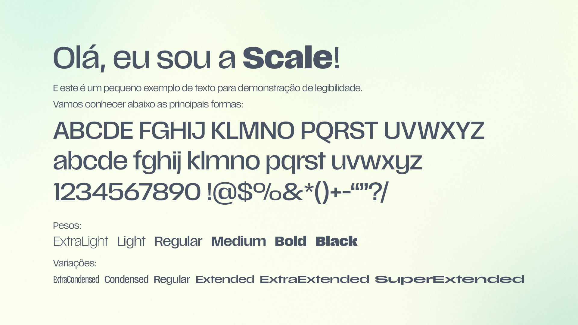 Por ser uma fonte variável, dá um grande leque de possibilidades. Ela possui originalmente 6 pesos e 6 larguras como base, podendo ser trabalhada de diversas maneiras em nossas peças gráficas.