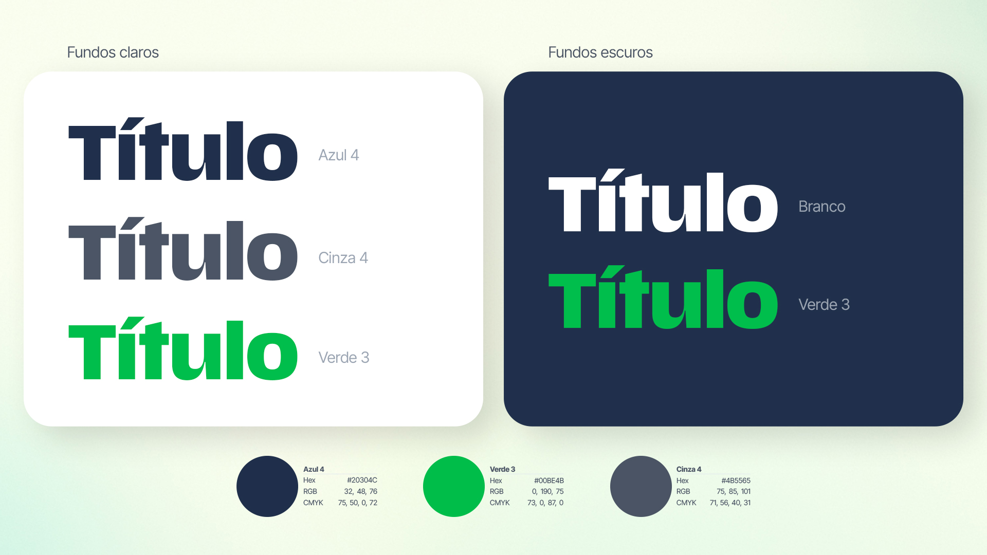 Com nossa paleta, temos neste exemplo o título aplicado no azul escuro da marca com destaque utilizando o verde primário do nosso símbolo. É uma forma trazer um ponto de atenção para uma palavra, termo ou frase. Já o parágrafo utiliza o cinza médio. Veja mais abaixo as indicações de cores para textos.