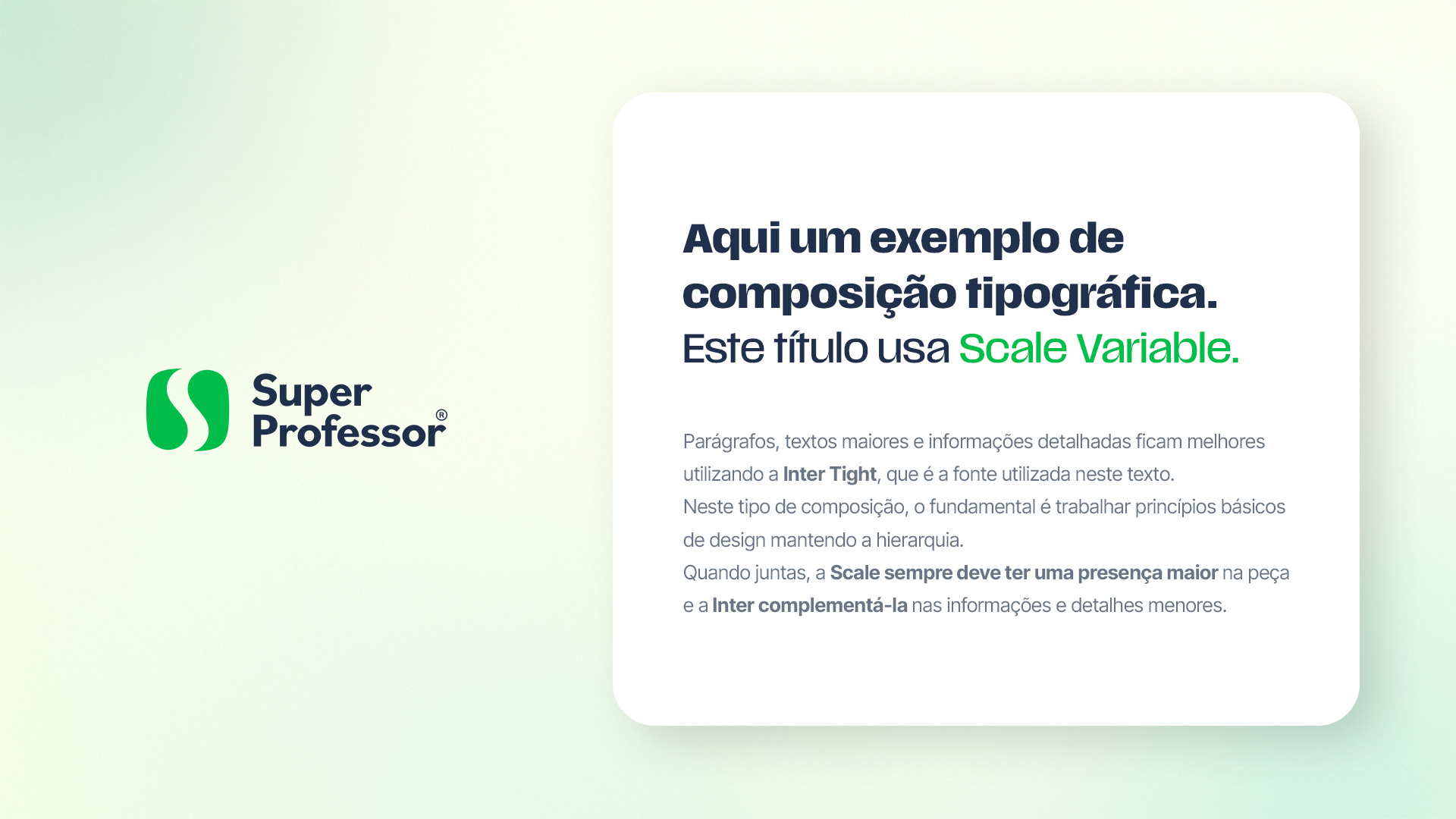 Tanto no título quanto no parágrafo, foram utilizados diferentes pesos para gerar contraste entre os elementos e destacar informações mais importantes. O título traz a Scale em pesos Bold e Regular enquanto o parágrafo traz a Inter Tight Regular com destaques em Bold.